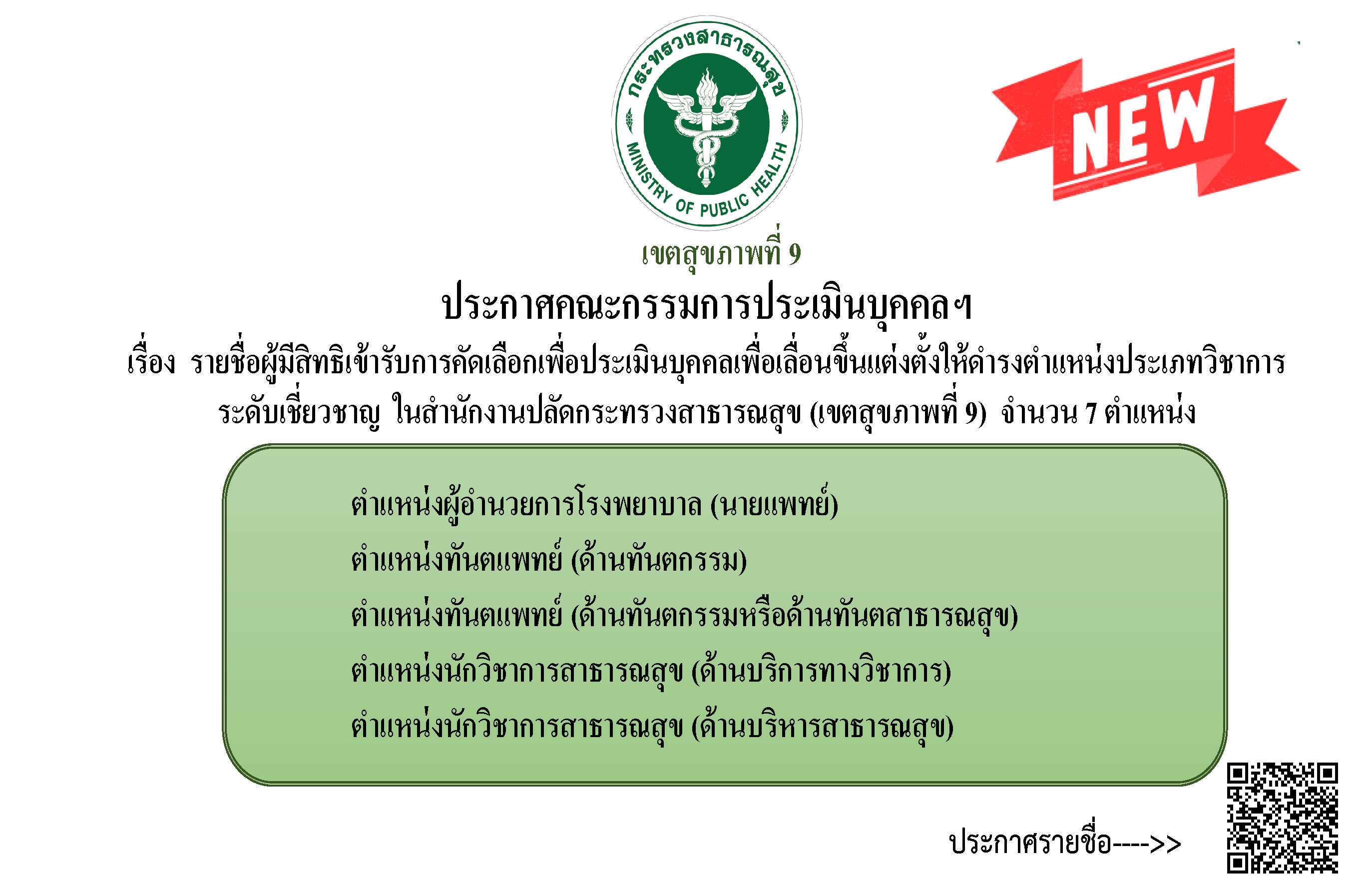 | 8 | CHRO | ประกาศประธานคณะกรรมการประเมินบุคคลเพื่อการย้าย การโอน และการเลื่อนขึ้นแต่งตั้งให้ดำรงตำแหน่งประเภทวิชาการ ระดับเชี่ยวชาญ ในสำนักงานปลัดกระทรวงสาธารณสุข (เขตสุขภาพที่ ๙) | 2025-10-01 11:36:31 | ข้อมูล |